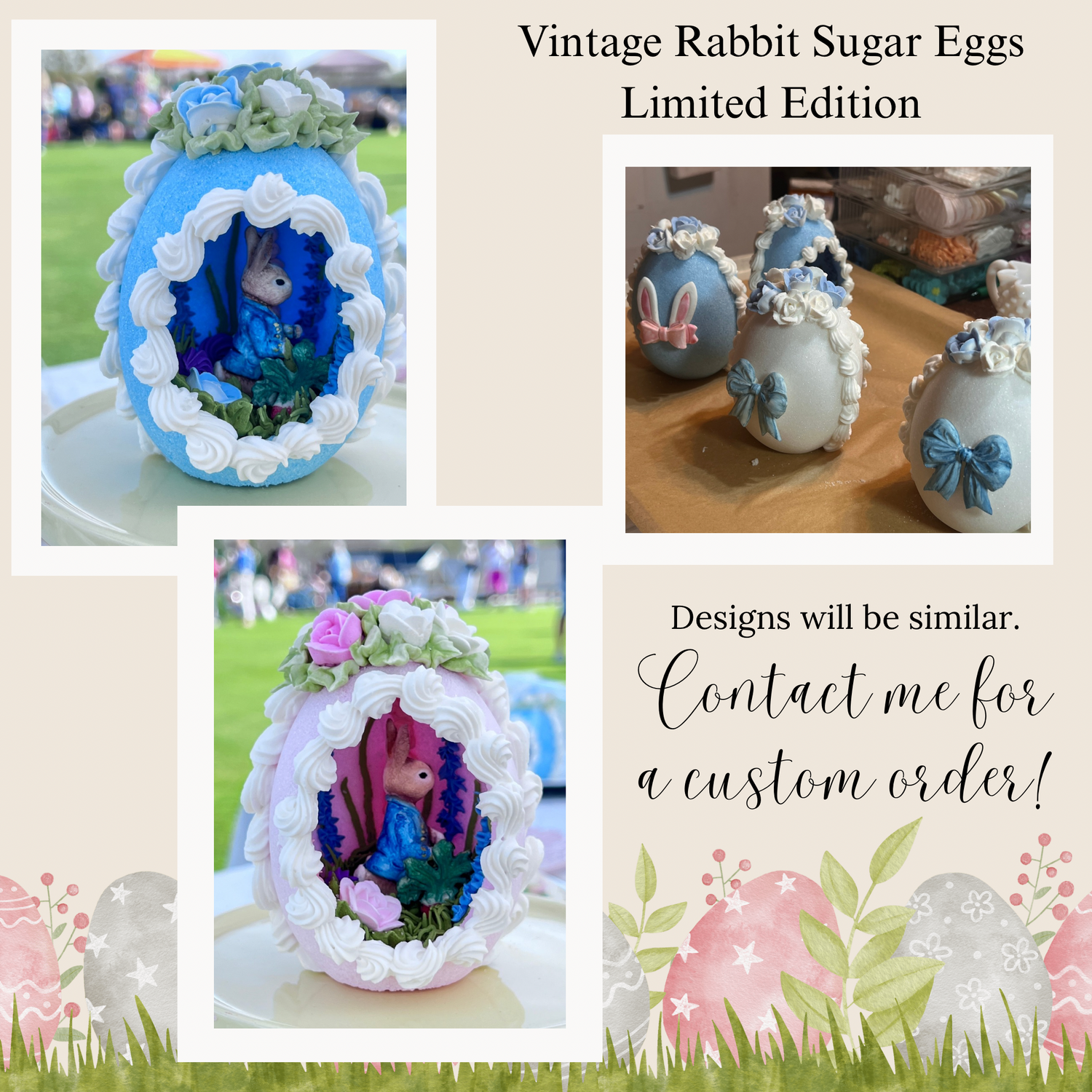 This is vintage bunny sugar egg is a limited edition keepsake. Each egg is unique and ideal for Easter baskets, table centerpiece or special gift. A delightful bunny dressed in a little blue jacket sits peacefully amid lush foliage and English garden details. Not intended for consumption (decorative only - sugar art like this is meant to be admired!)