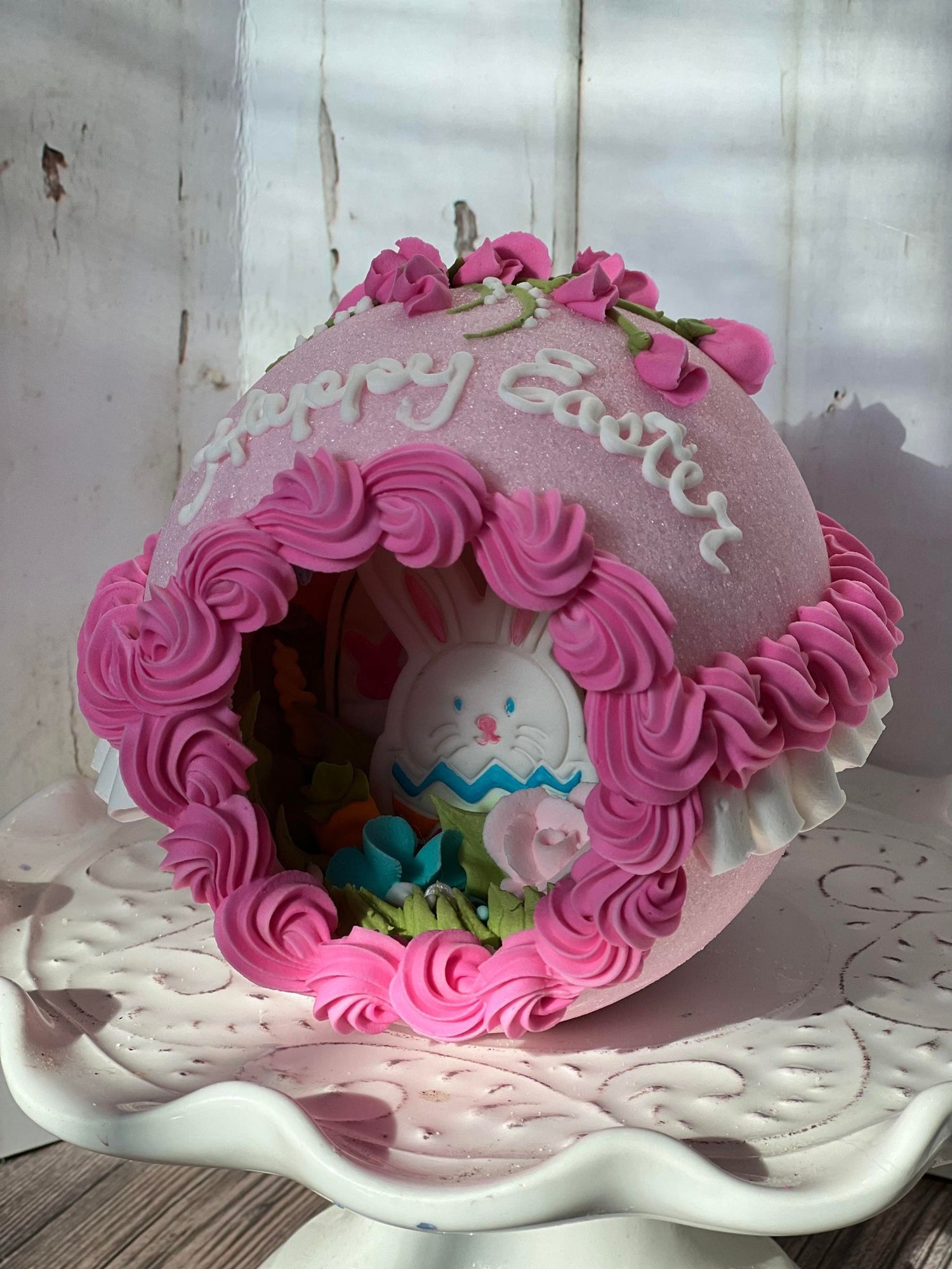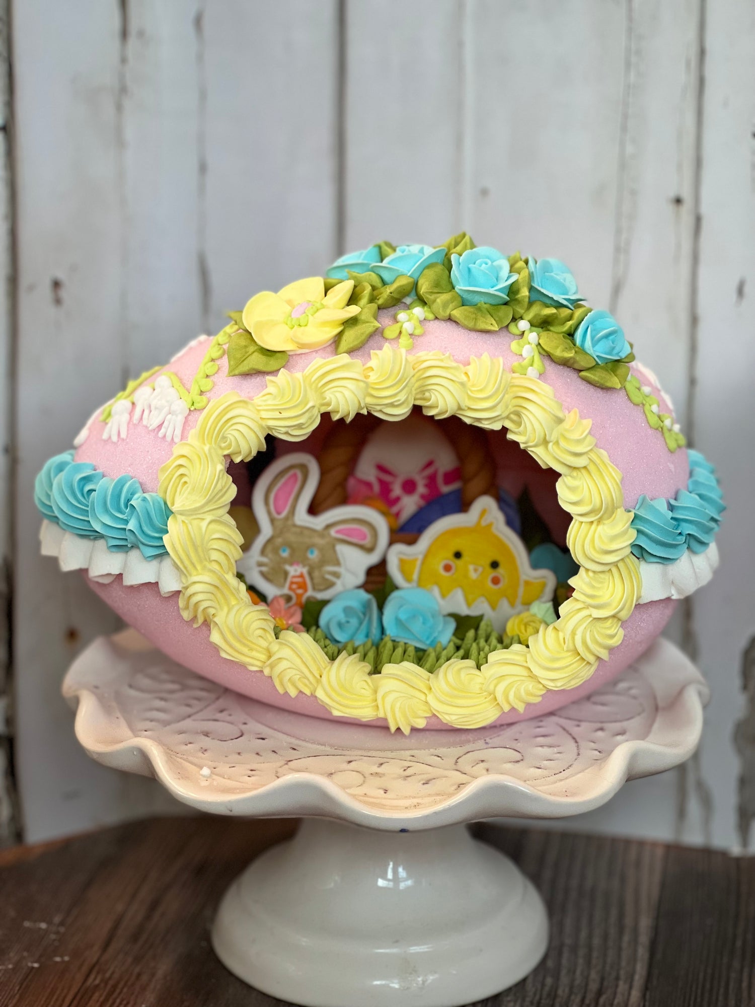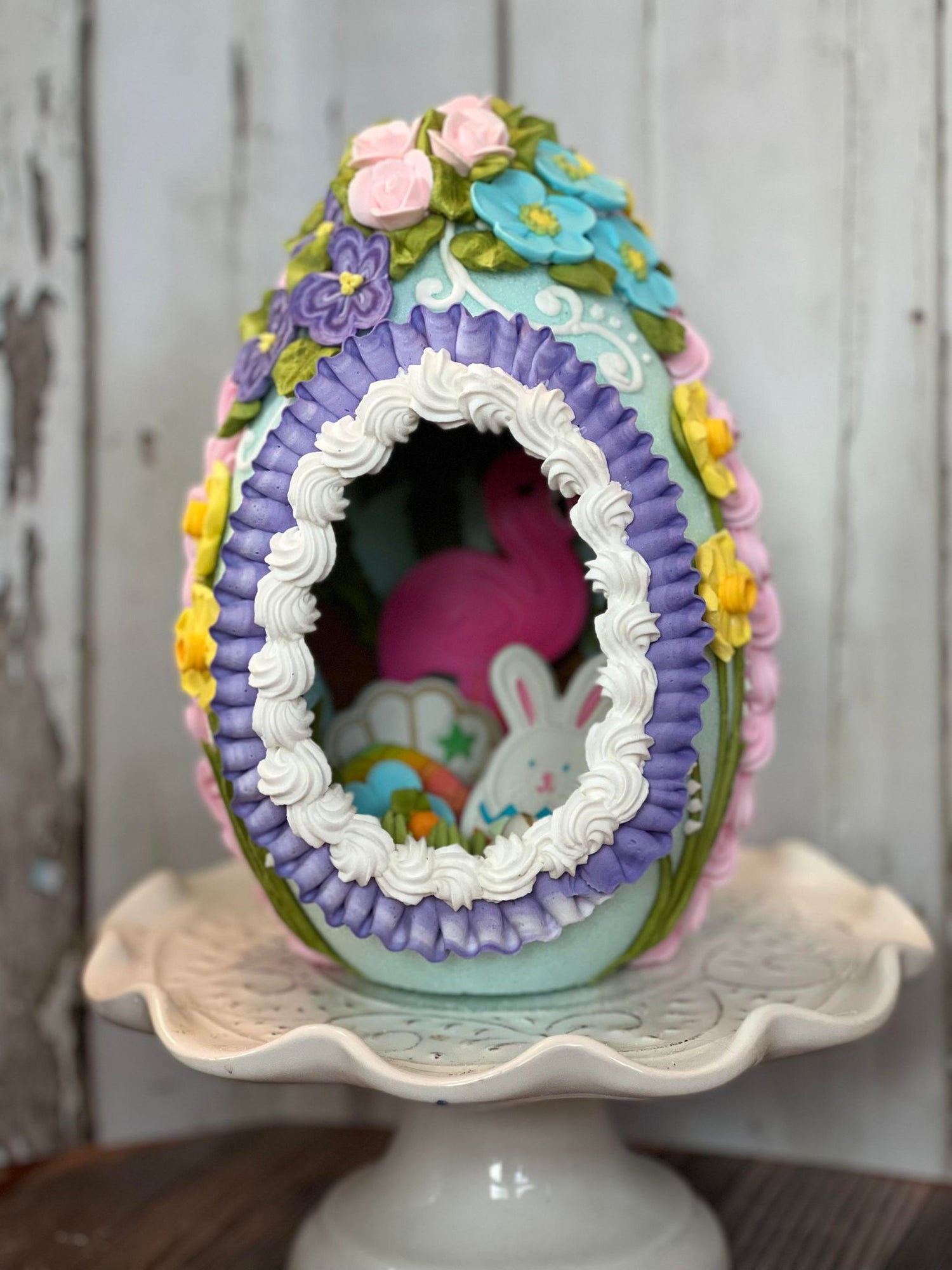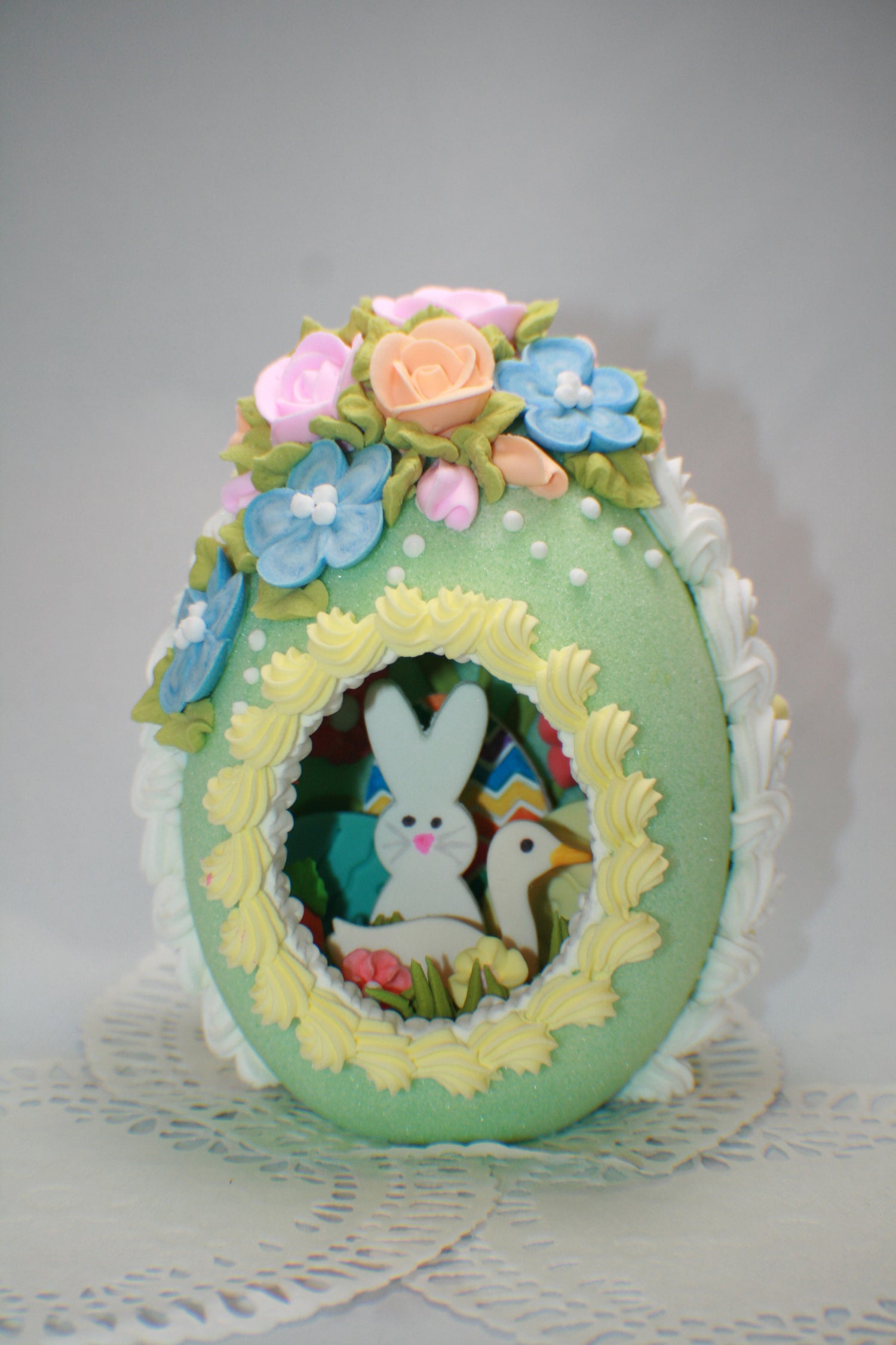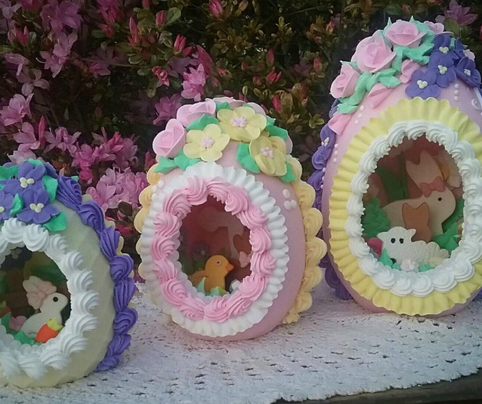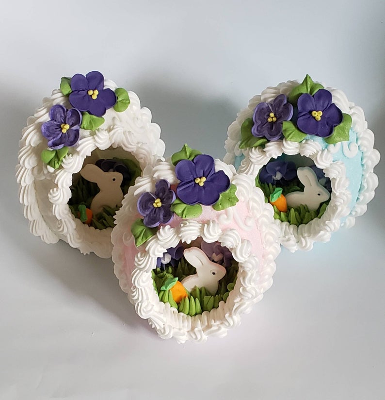 I make everything you see on and inside the eggs myself. Gum paste made from scratch, royal icing made from scratch, sugar eggs mixed and packed by hand in small batches.