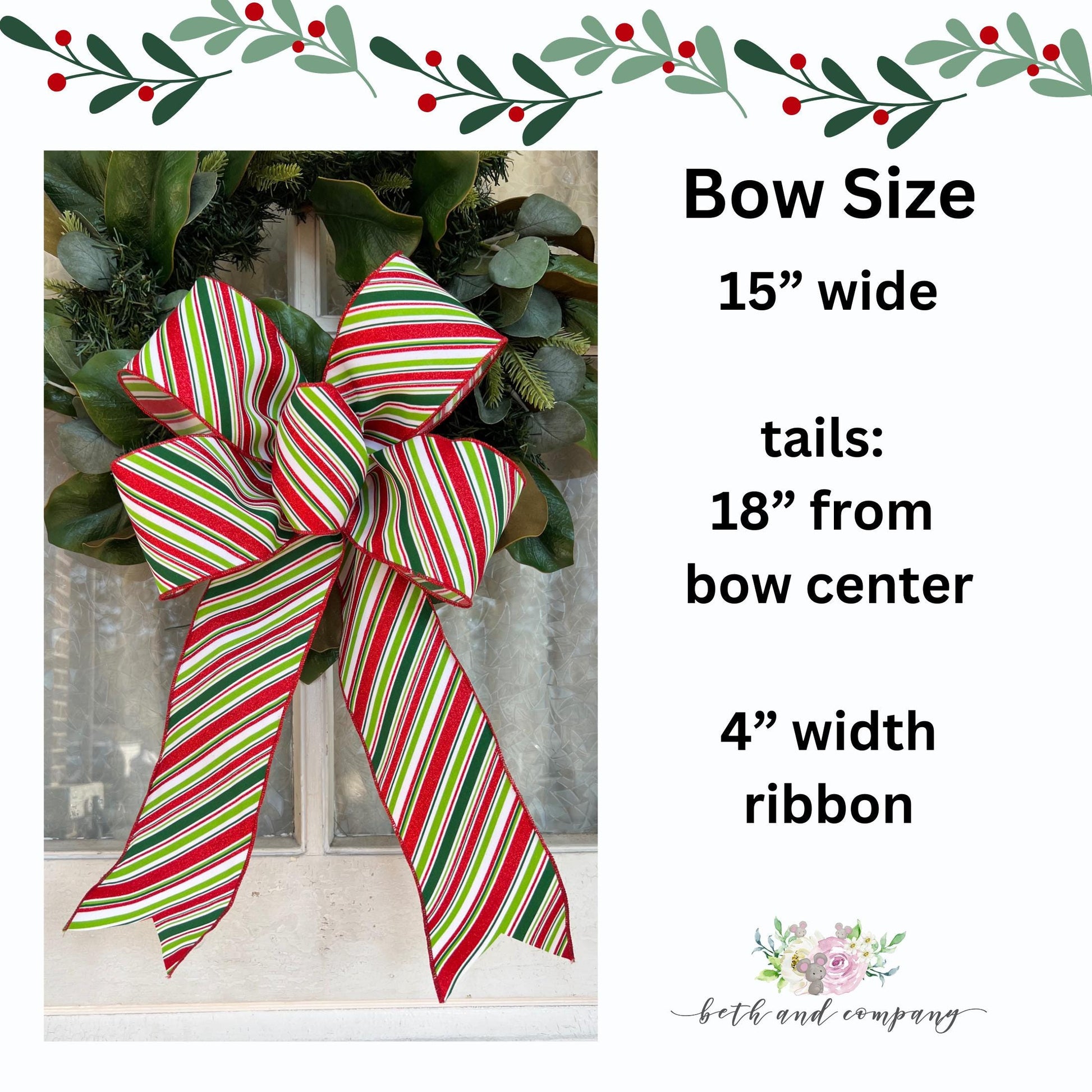 This 5 loop, 15” Christmas bow is made with 4" width wired diagonal striped ribbon. The bow has four 7.5" long loops, one center loop and two 18" tails. It is bound with a zip tie and binding wire with long tails to attach to your wreath, tree or lantern.