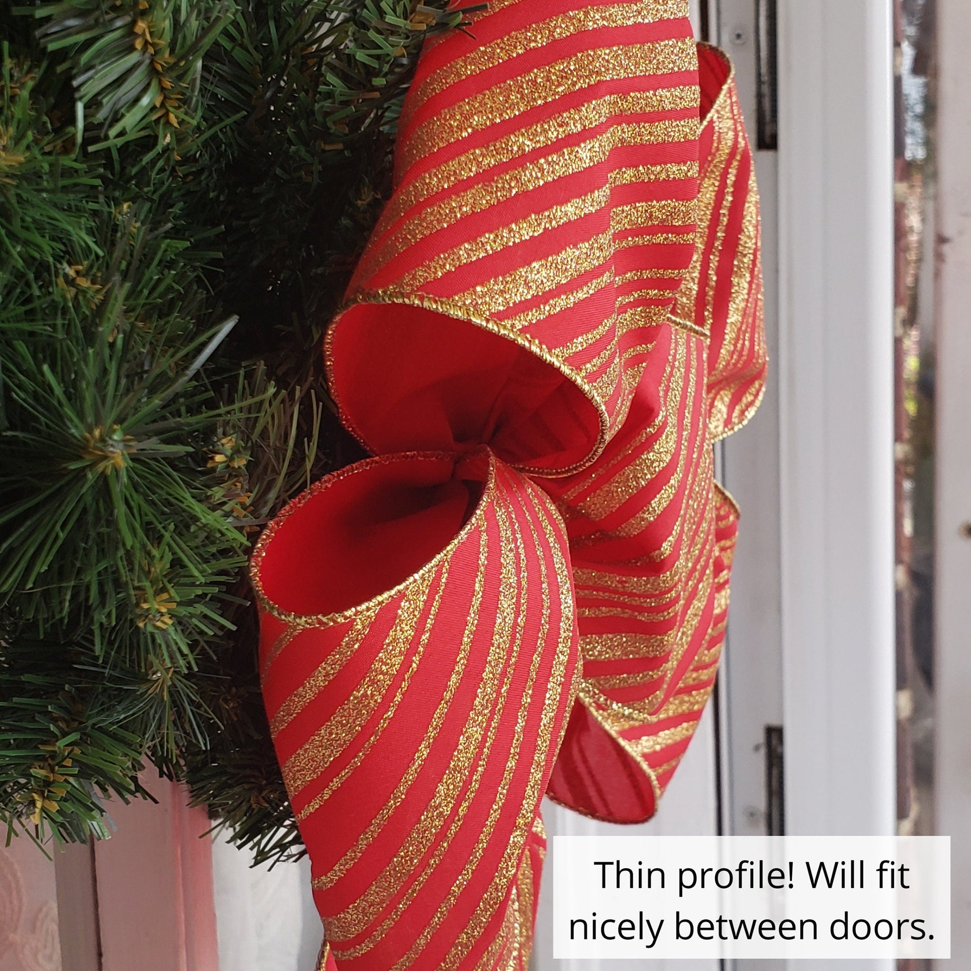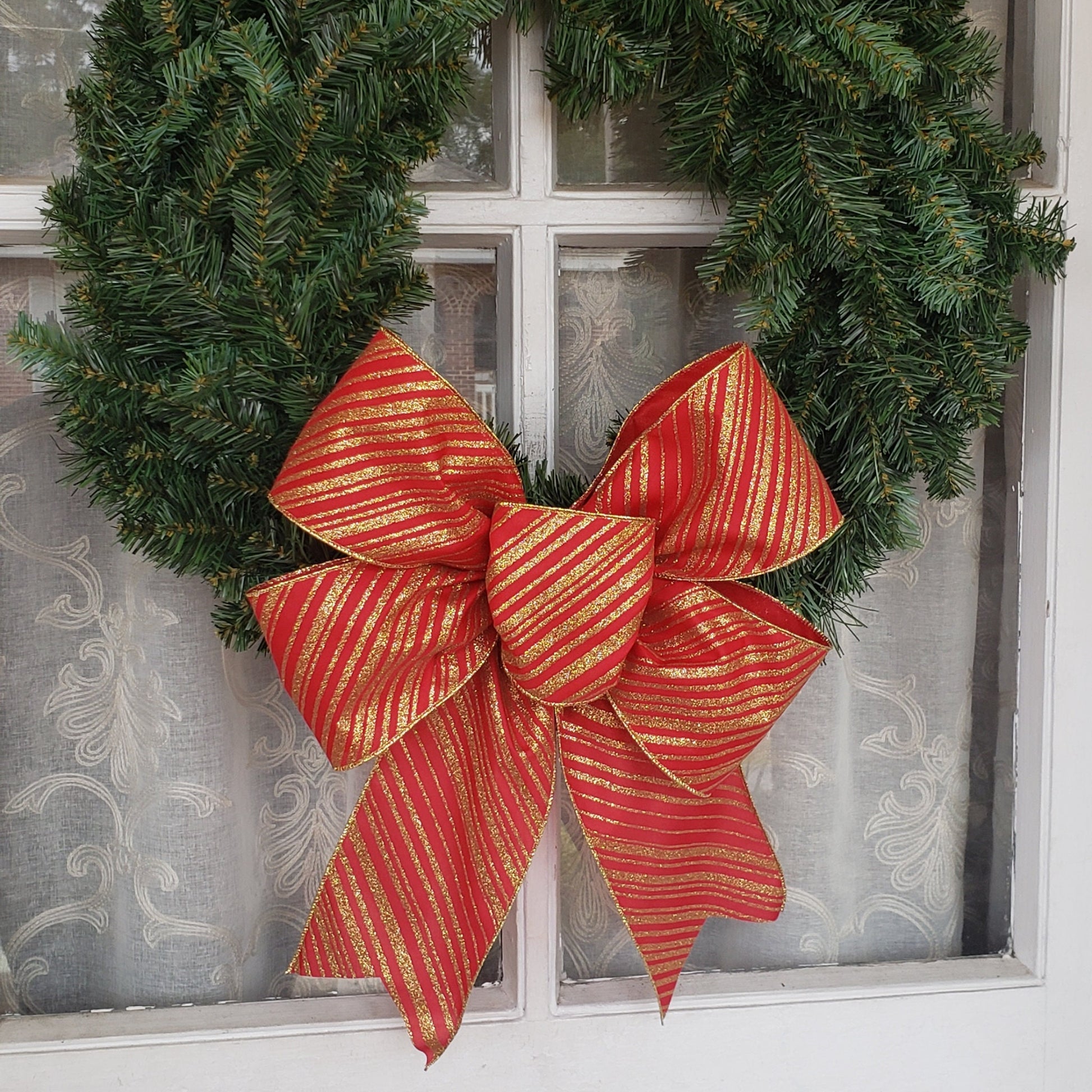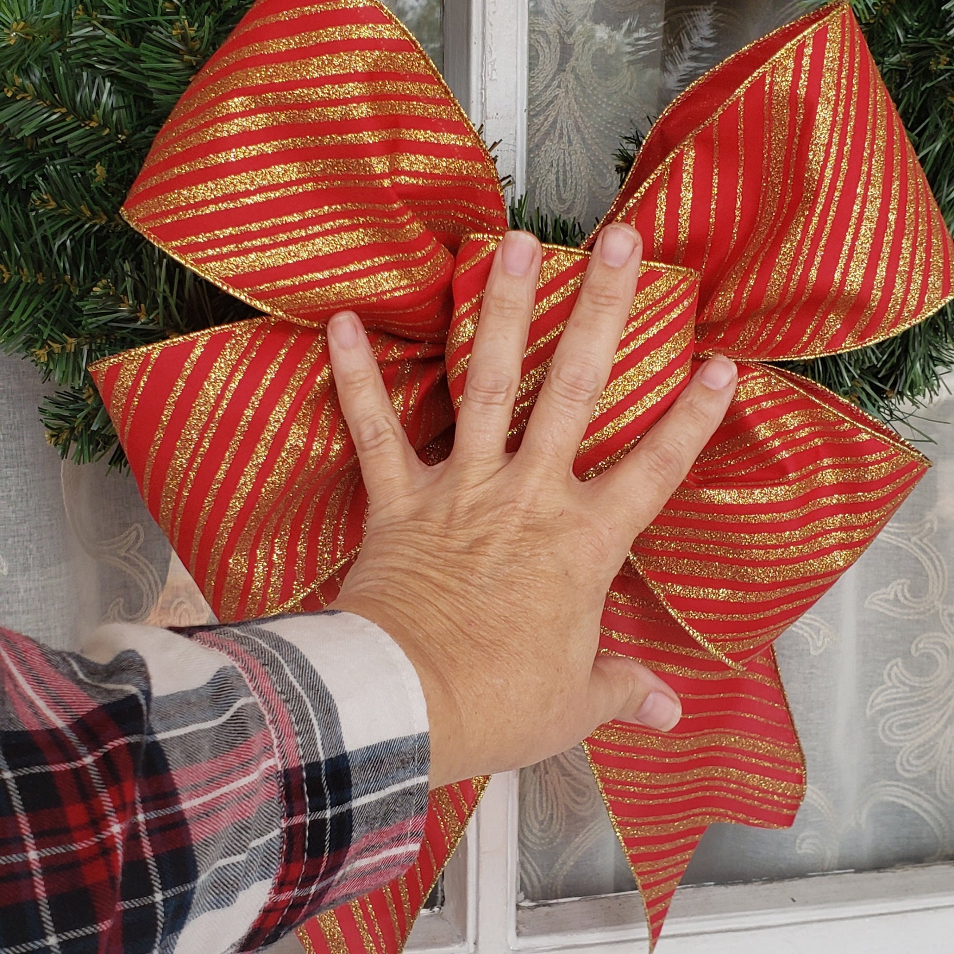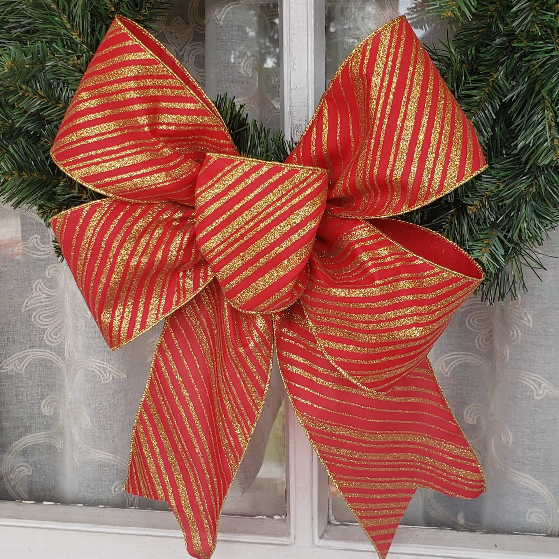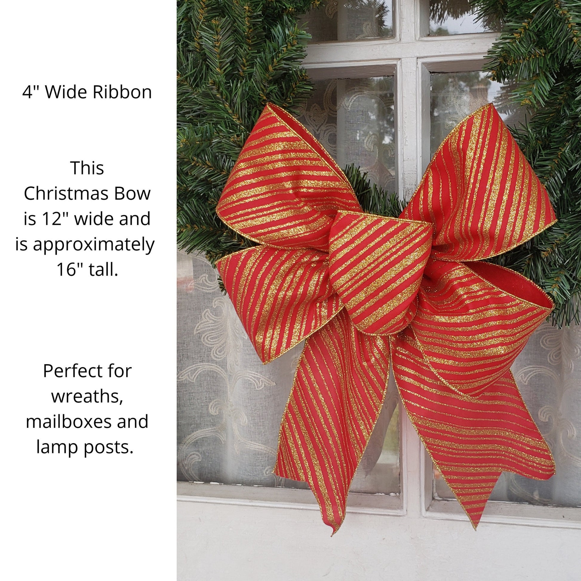 This Red and Gold Glitter Stripe Christmas Bow is made from 4" wide ribbon. Perfect for your mailbox. lantern or wreath.