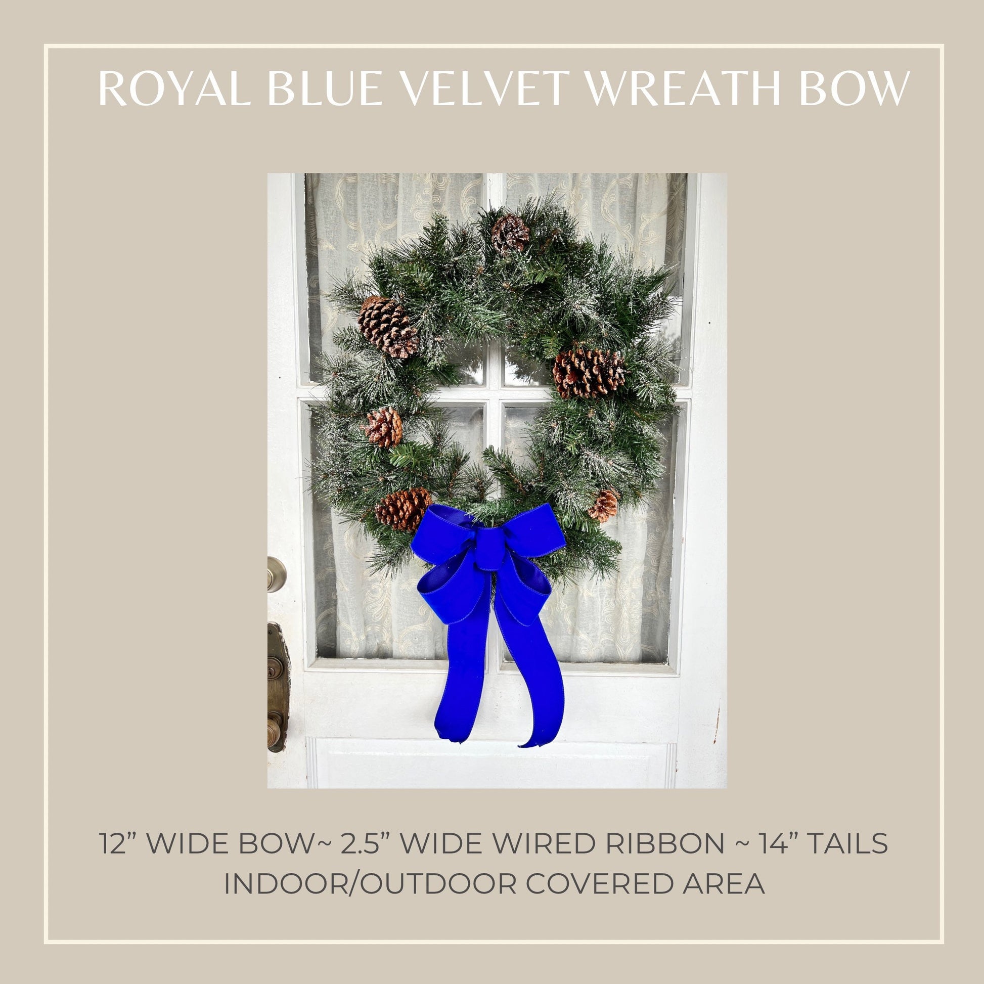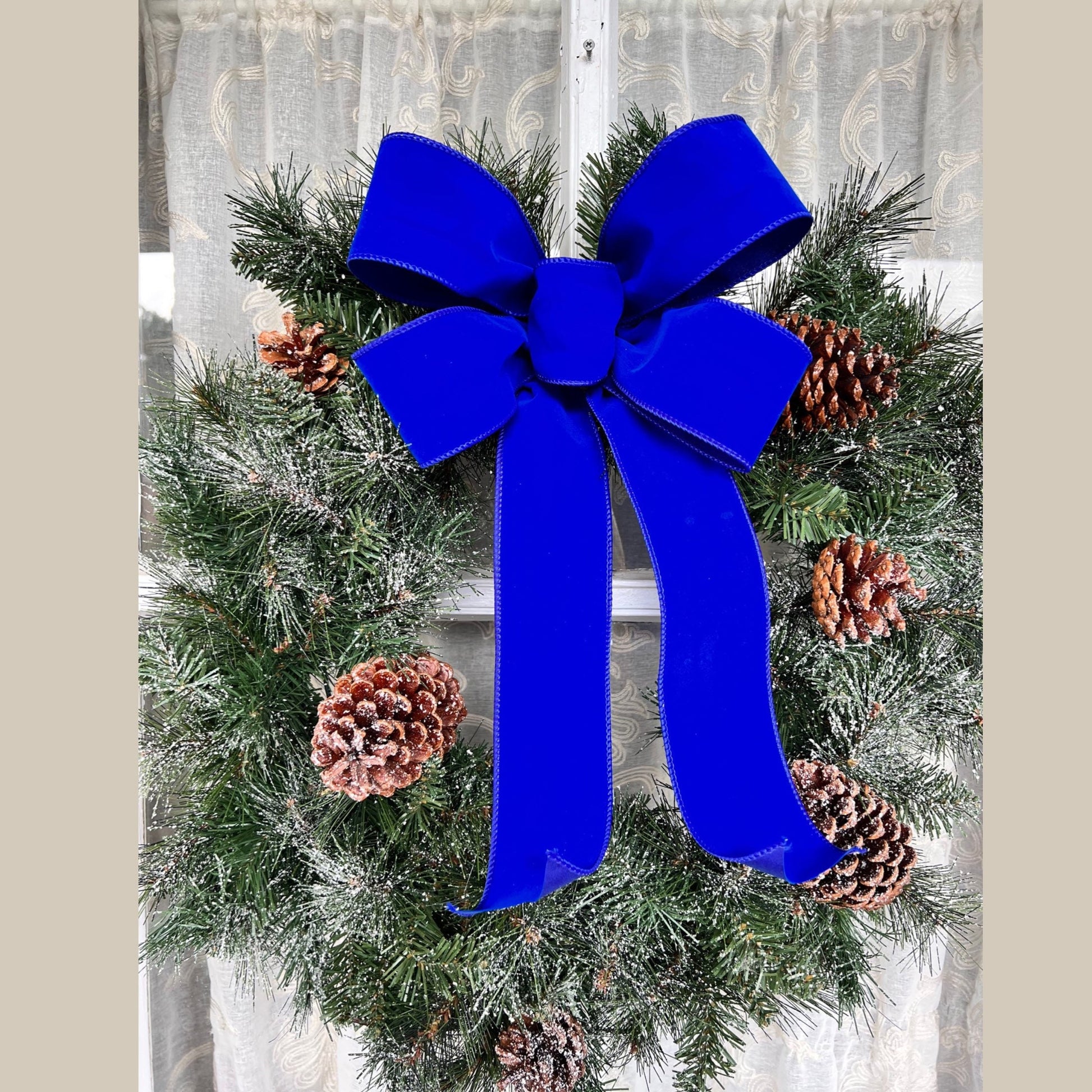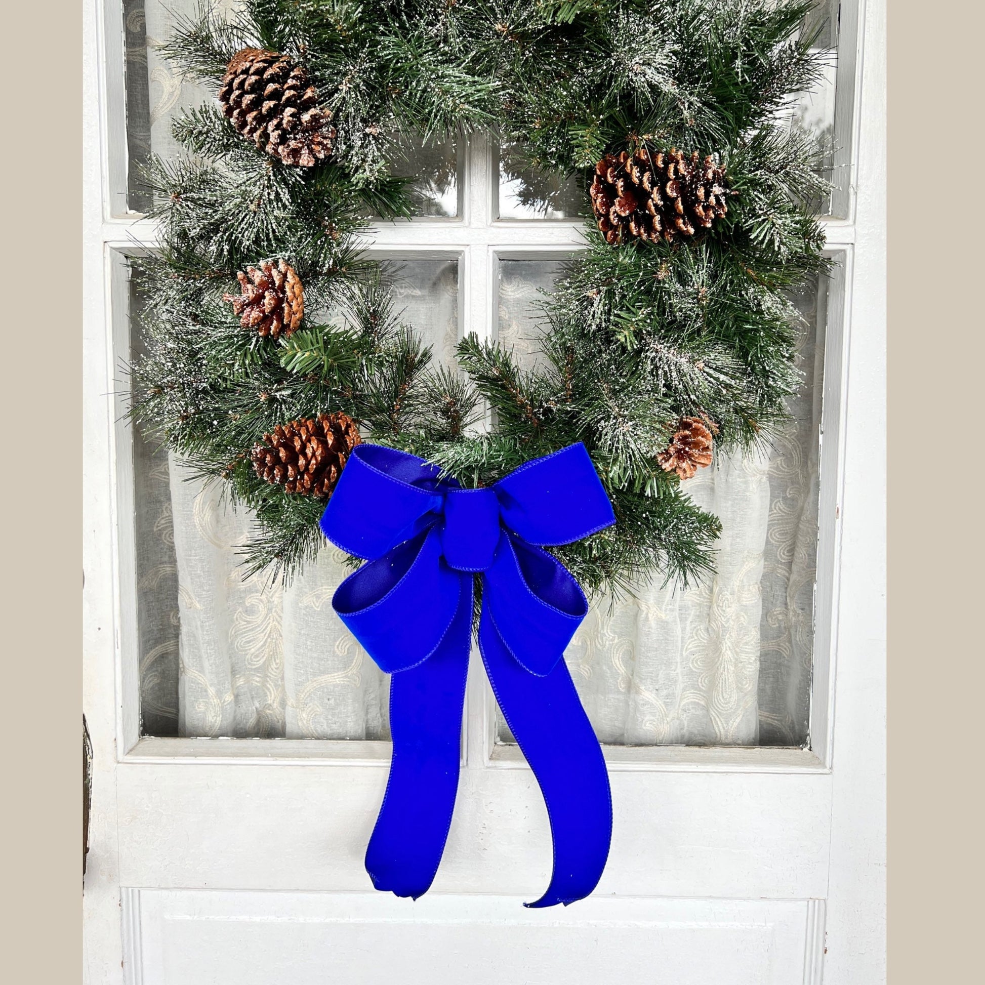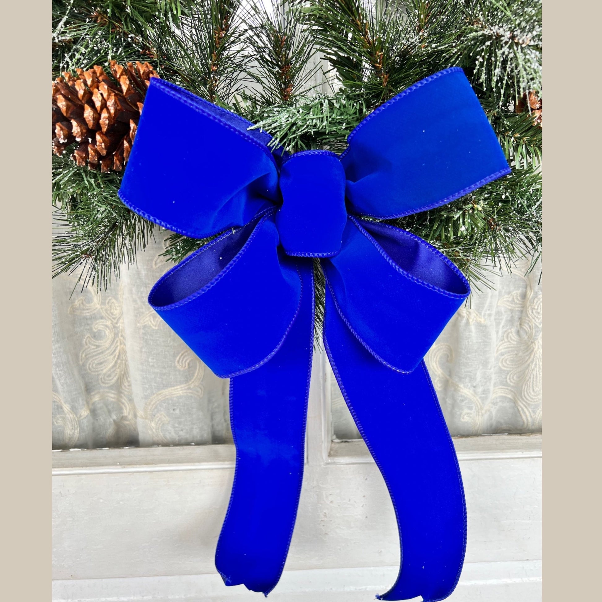 Royal blue velvet makes a beautiful bow. This Christmas bow is made with 2.5" width wired velvet ribbon. The bow has four 6" long loops, one center loop and two 14" tails. It is bound with a zip tie and binding wire with long tails to attach to your wreath, tree or lantern.
