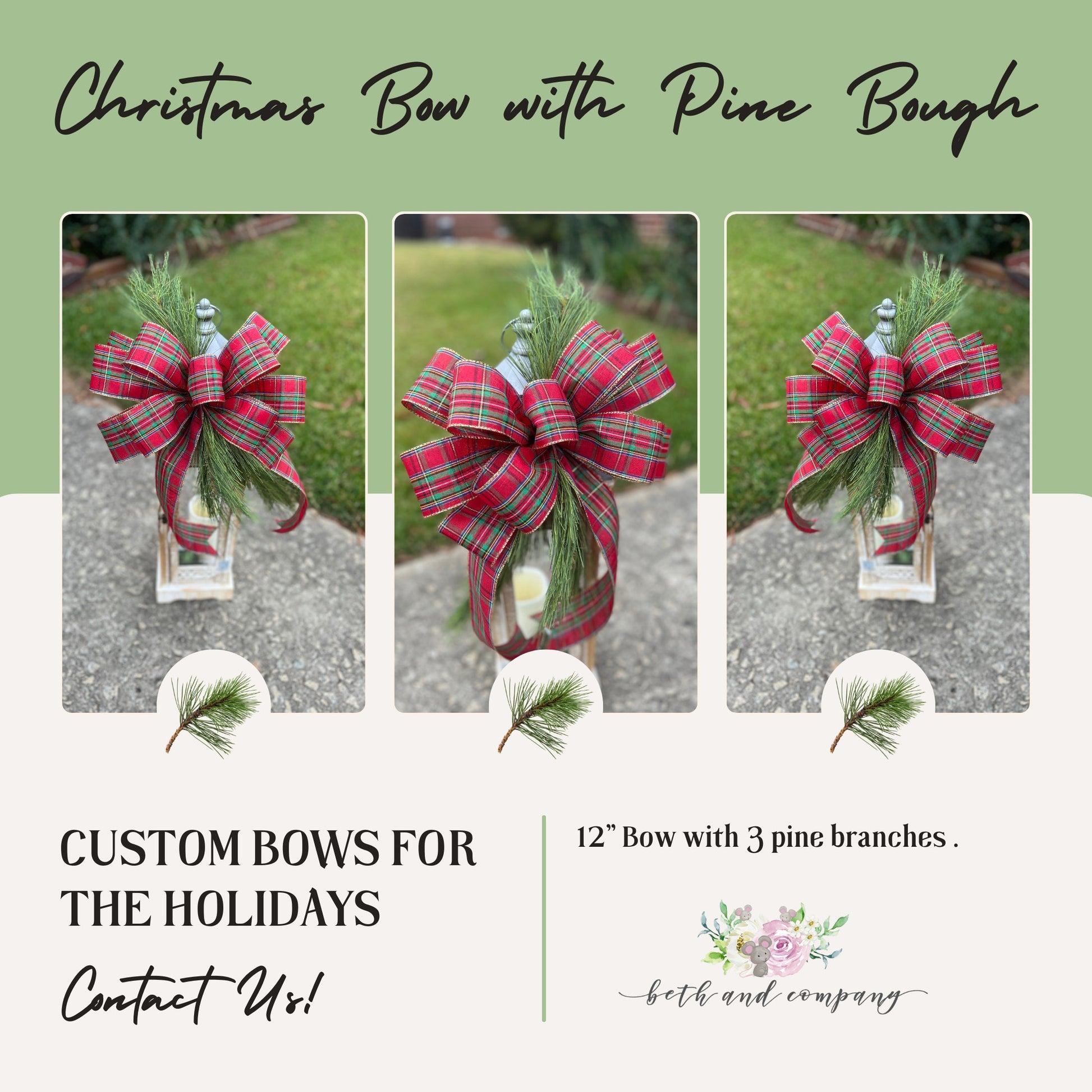 Christmas Bow Christmas Tartan Plaid Bow with Pine Branch Red Christmas Bow for Front Door Lantern Swag