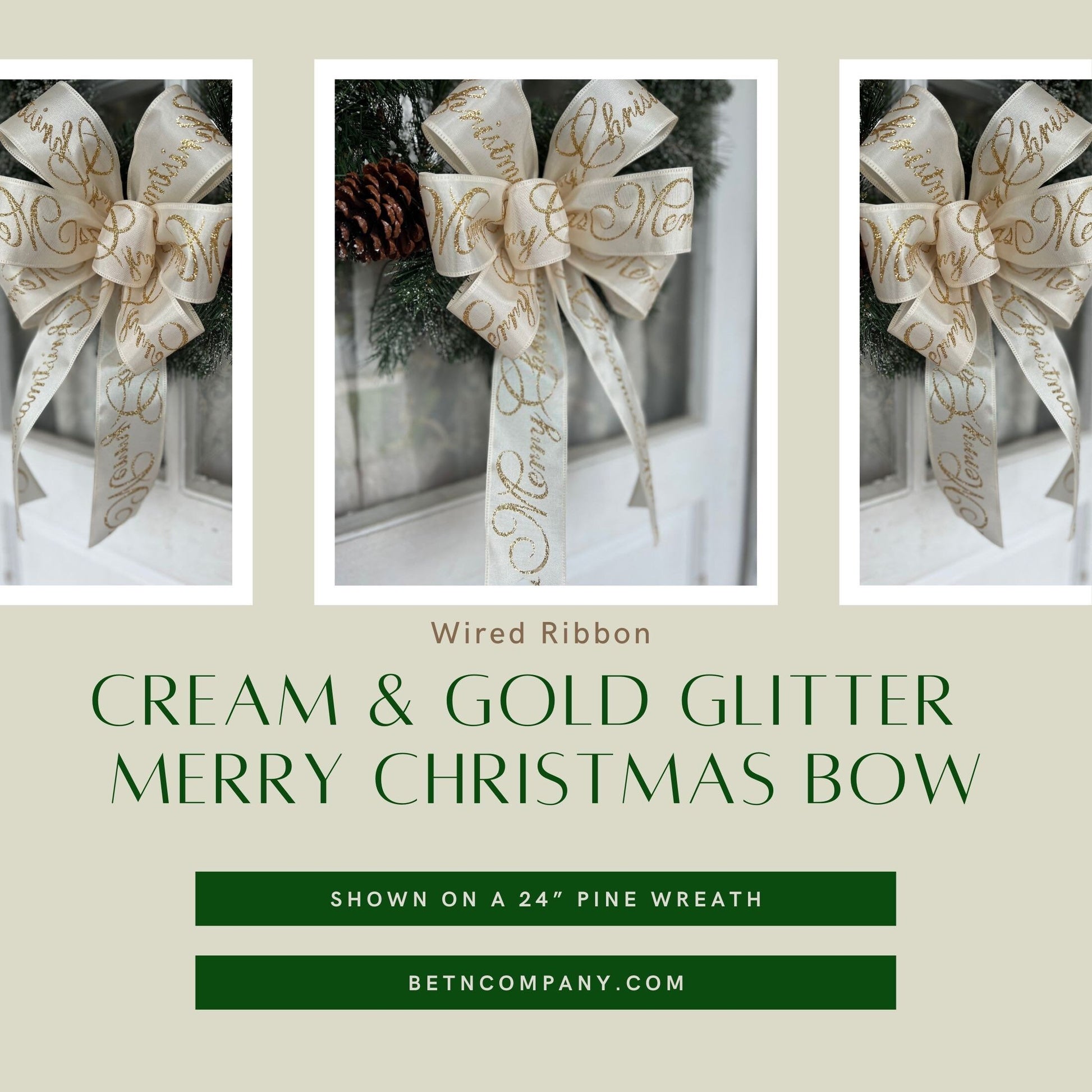 Christmas Bow Gold Glitter & Ivory Bow Merry Christmas Script Matching Lantern Bow Gift Basket Christmas Gift Bow