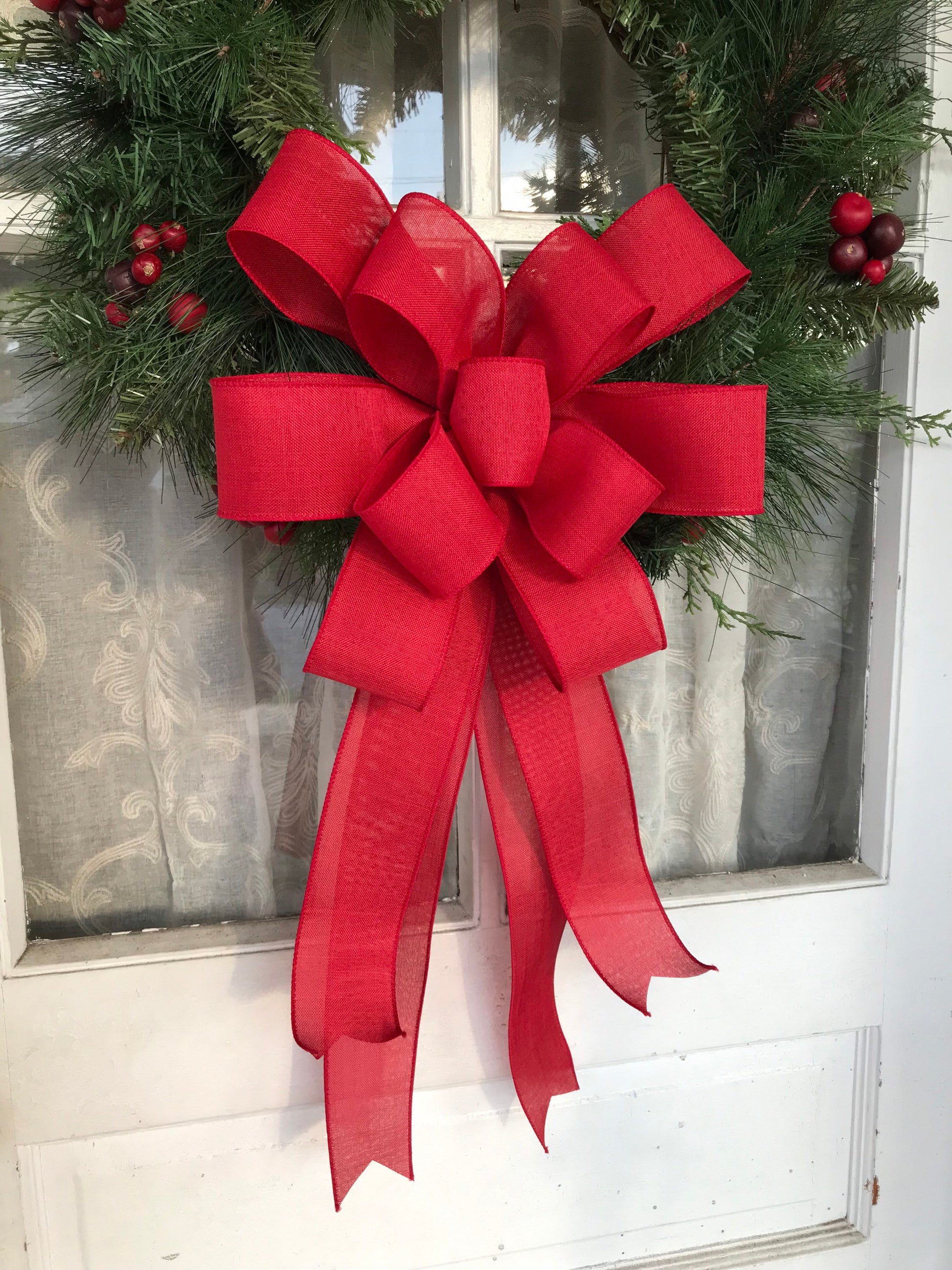 BIG Red Farmhouse bow. This 14" wide bow is perfect for Christmas and Valentine’s Day! Lovely red linen wired ribbon. Perfect for the larger wreaths, mailboxes or hanging with garlands up high. Some of my customers have purchased these to decorate their church sanctuary. Other solid color linen ribbon is available upon request.