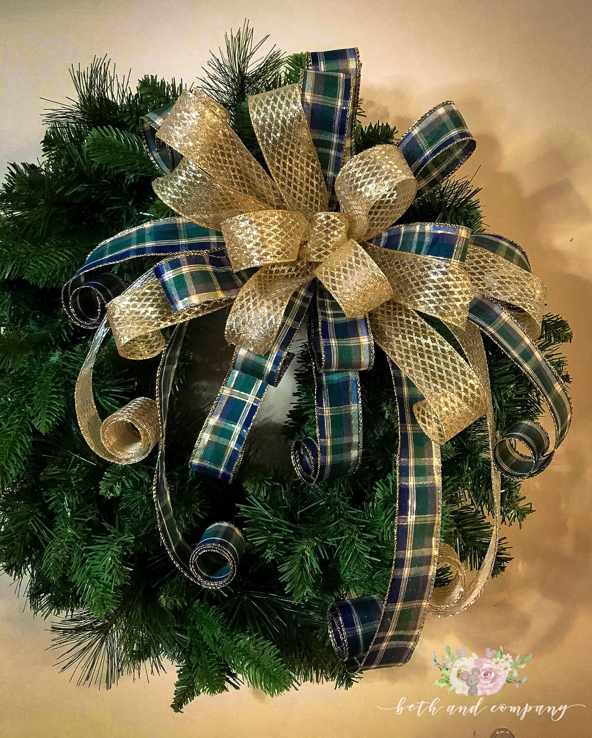 Navy Blue and Gold Glitter Christmas Wreath Bow, Navy and Gold Decoration. This is a light and airy navy and gold wreath bow. Made using 1.5" width wired ribbon. The ends are dovetailed and curled. It is shown on a 24" wreath. It would look great on a 30"/32"- 38" wreath.