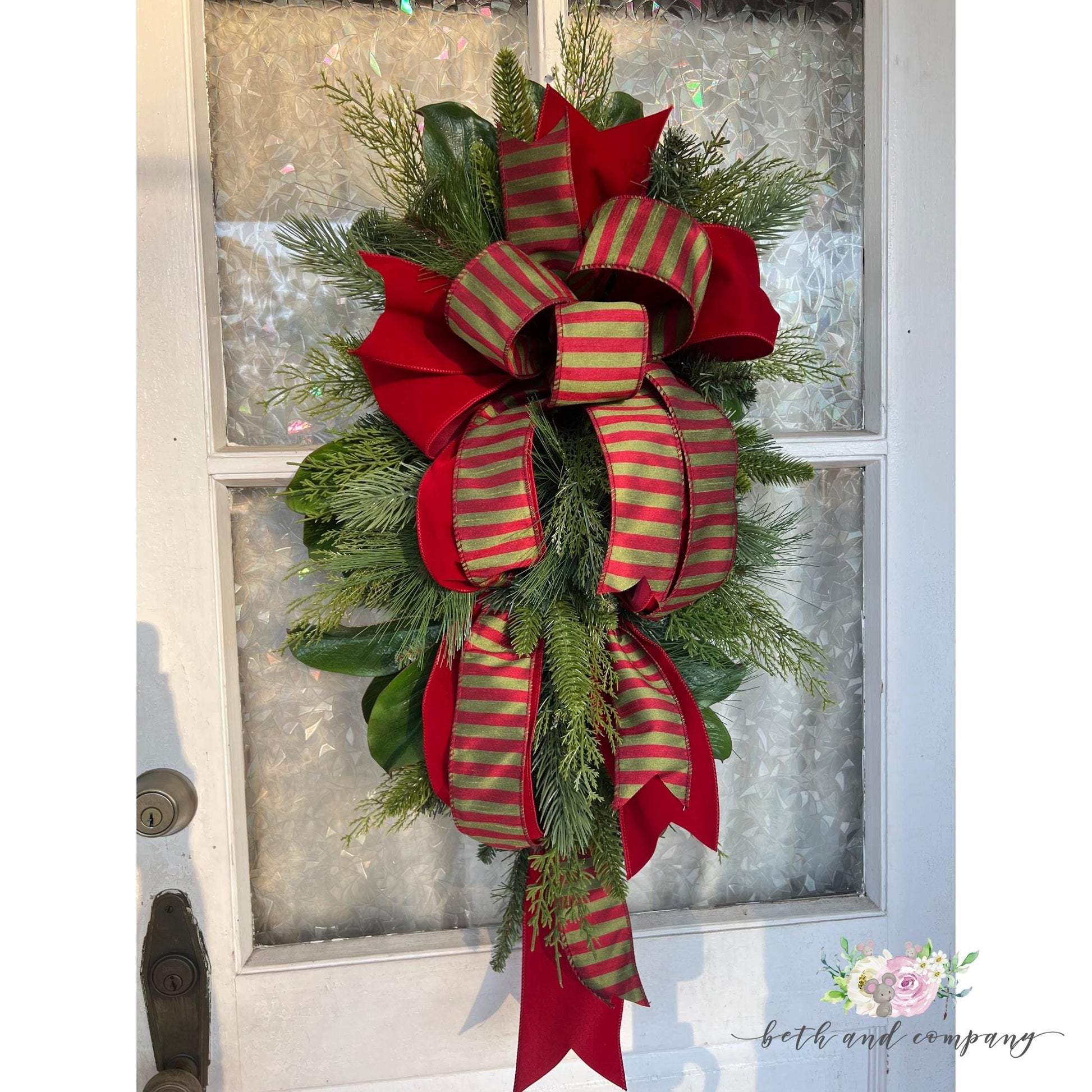 A 36” mixed greenery teardrop swag features an elegant blend of lush, seasonal greenery such as pine, magnolia, fir, and cedar, artfully arranged into a teardrop shape. Accented with vibrant scarlet red velvet and shimmering dupioni ribbon, the swag brings a festive and luxurious touch to holiday décor. Perfect for hanging on doors or mantels, the rich greenery is complemented by the soft texture of the velvet and the subtle sheen of the dupioni, creating a striking and elegant display for any space.