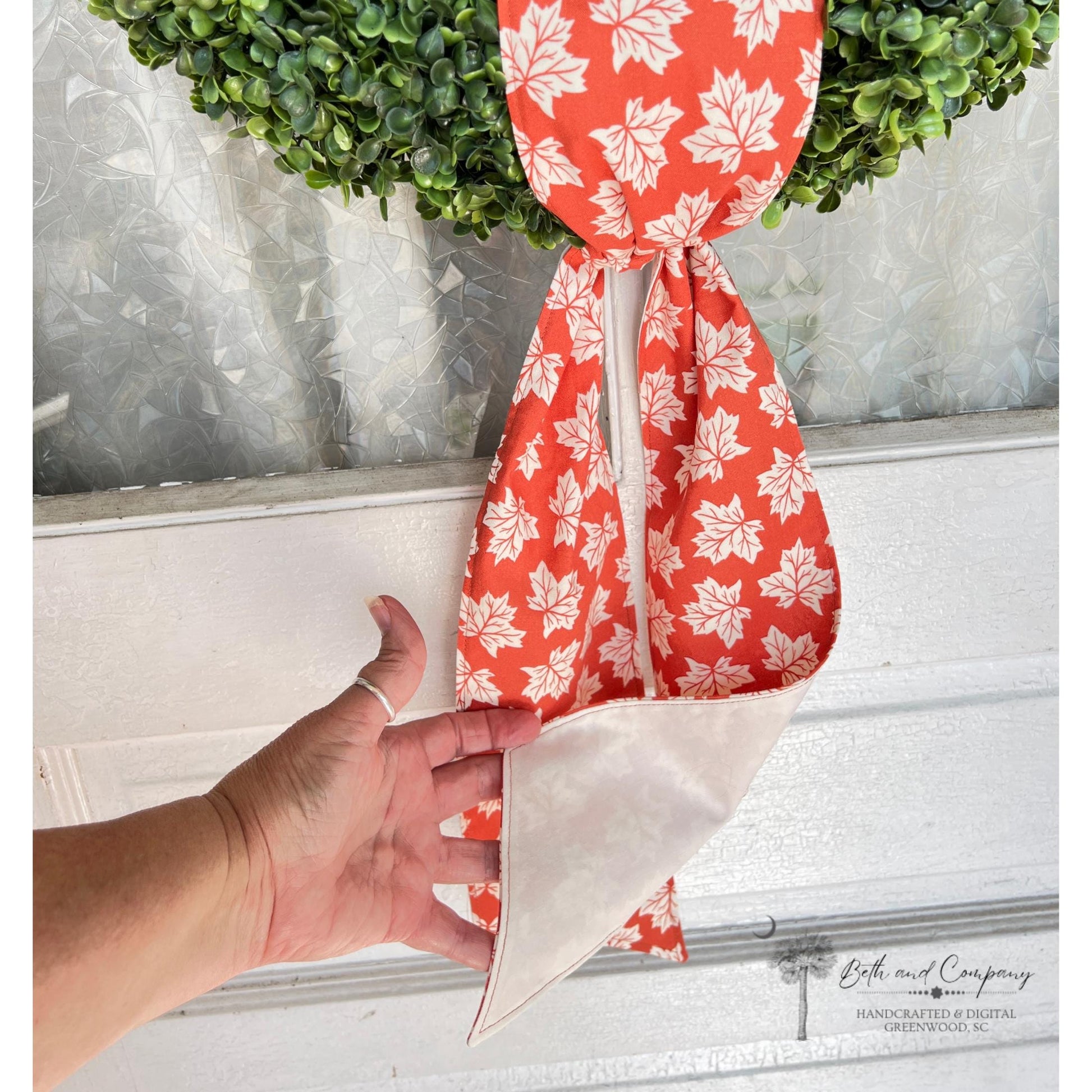 Bring a touch of autumn elegance to your front door with this handmade Fall Wreath Sash. Crafted from 100% premium quilting cotton, this autumn inspired sash features a simple maple leaf design — the perfect seasonal accent for your home. Whether you're refreshing your entryway or looking for a thoughtful housewarming gift, this sash adds cozy charm to any fall decor.