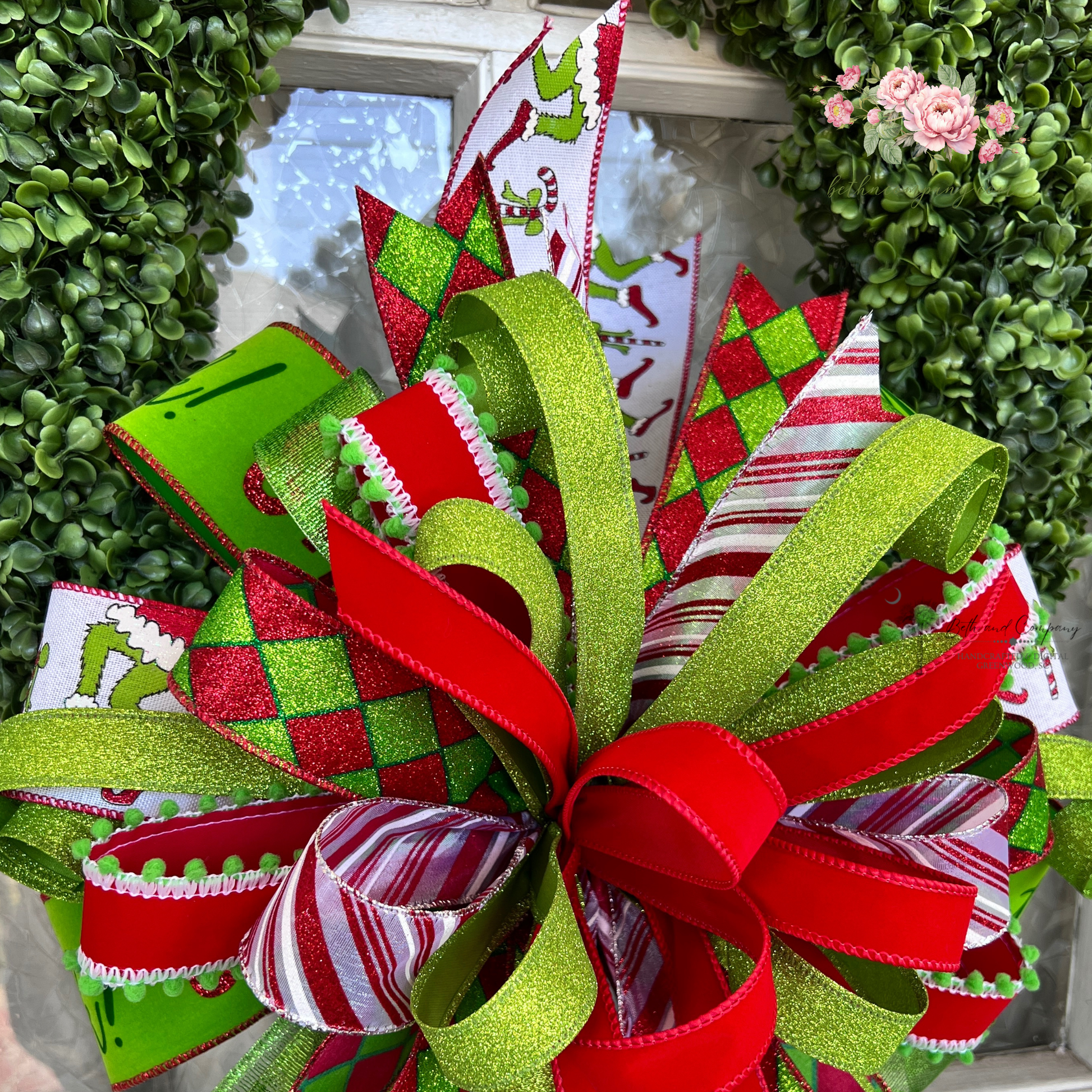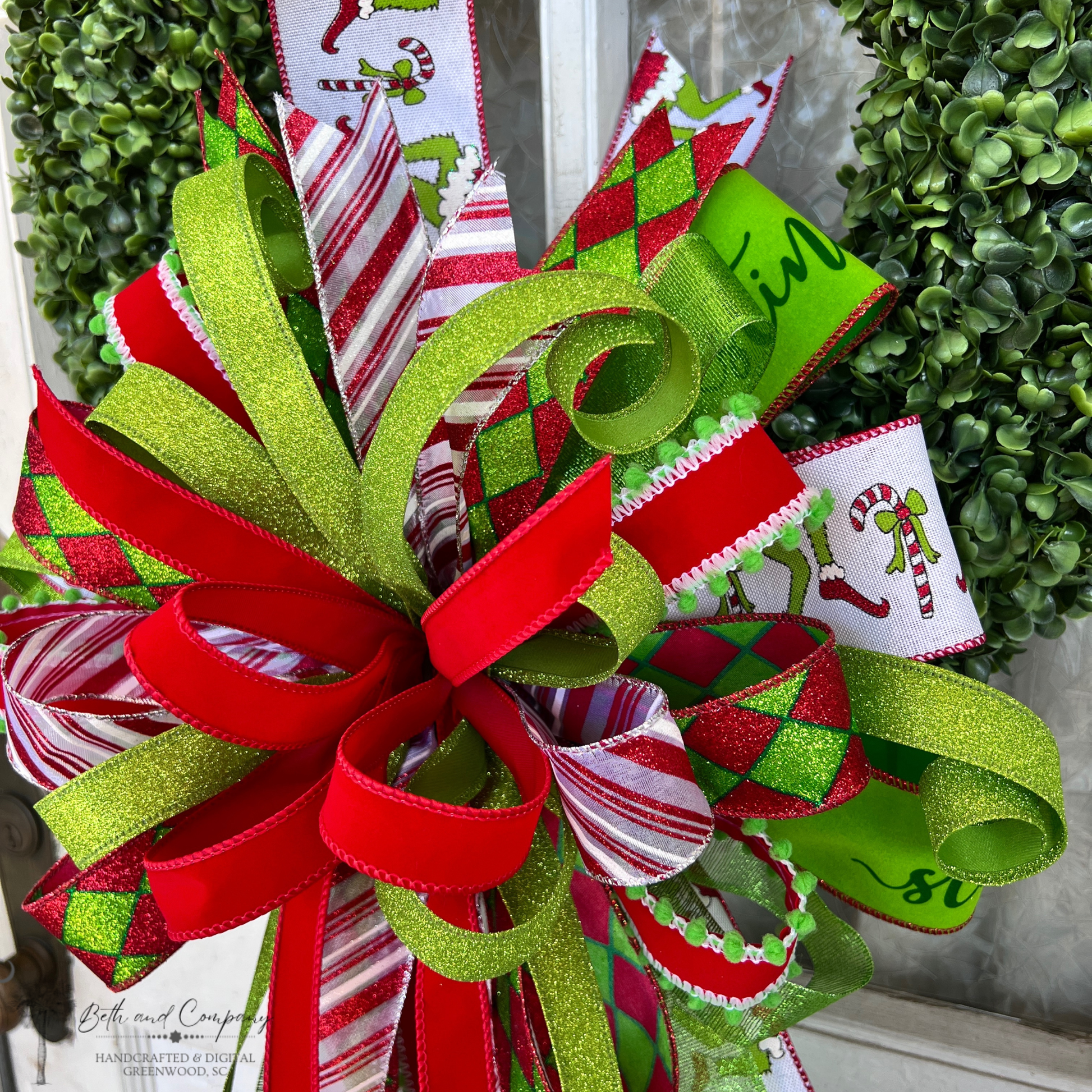 Bring playful Christmas cheer to your home with this whimsical lime-and-red holiday bow! Inspired by joyful Whoville-style decor, this oversized bow adds festive personality to trees, wreaths, lanterns, stair rails, and holiday displays.