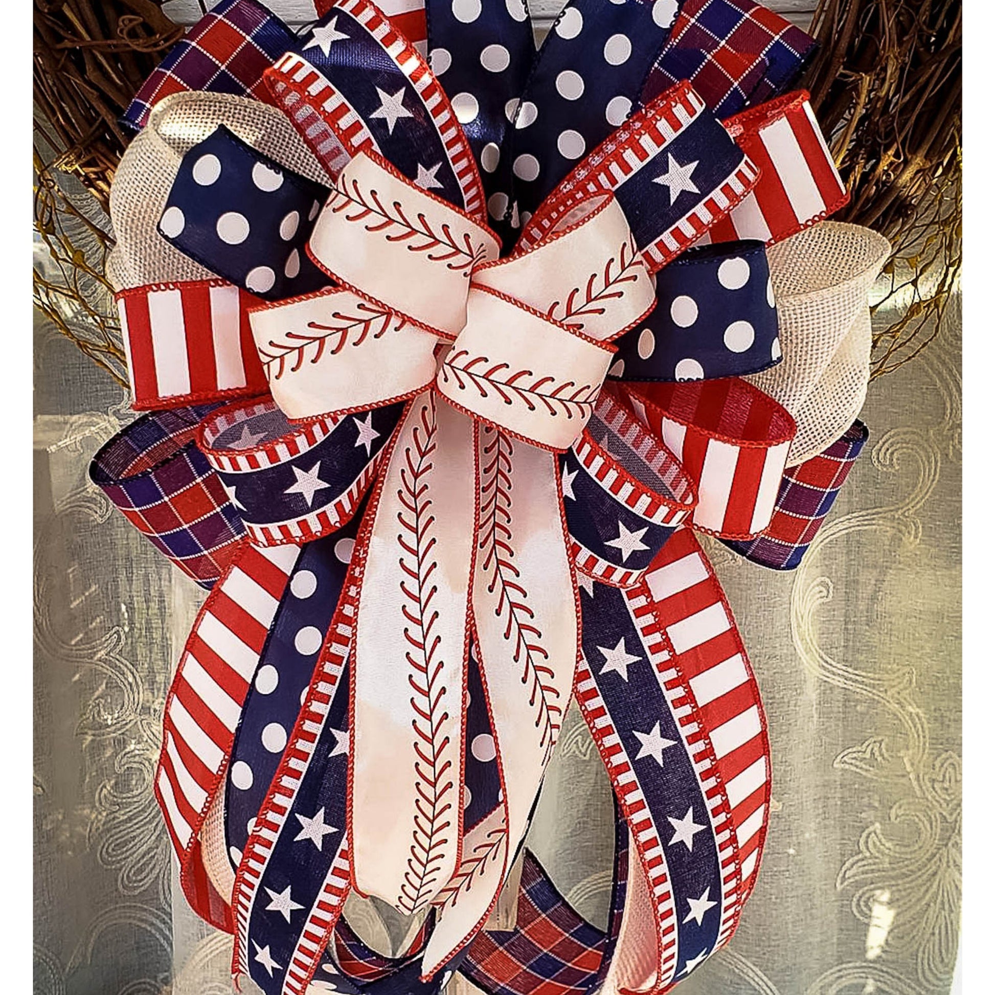 This patriotic baseball-themed bow features vibrant red, white, and blue ribbons, symbolizing American pride. The design includes stars and stripes, evoking the American flag, showcasing the stitching pattern in the center ribbons. This bow is capturing the spirit of both patriotism and America's favorite pastime. It’s perfect for sports events, national holidays, or any occasion celebrating the country's heritage and love for baseball.
