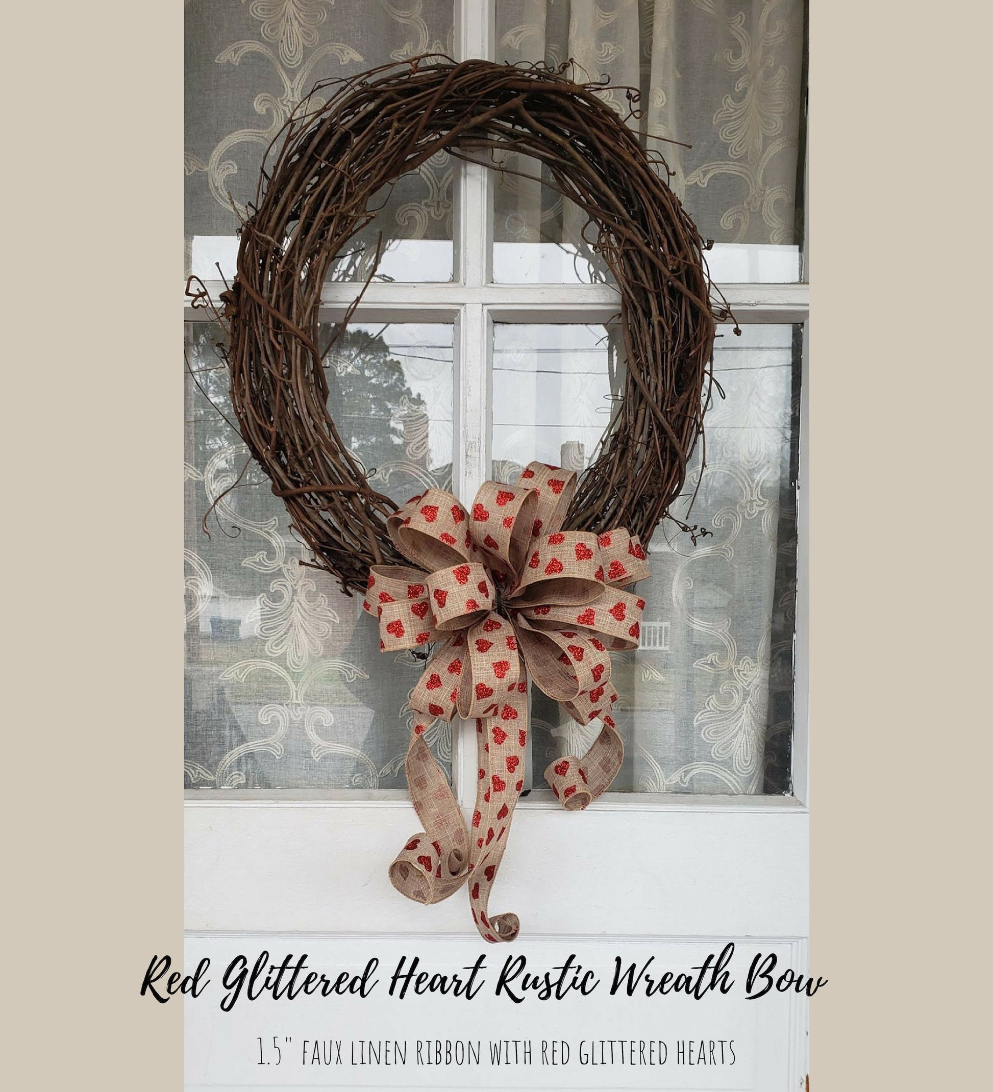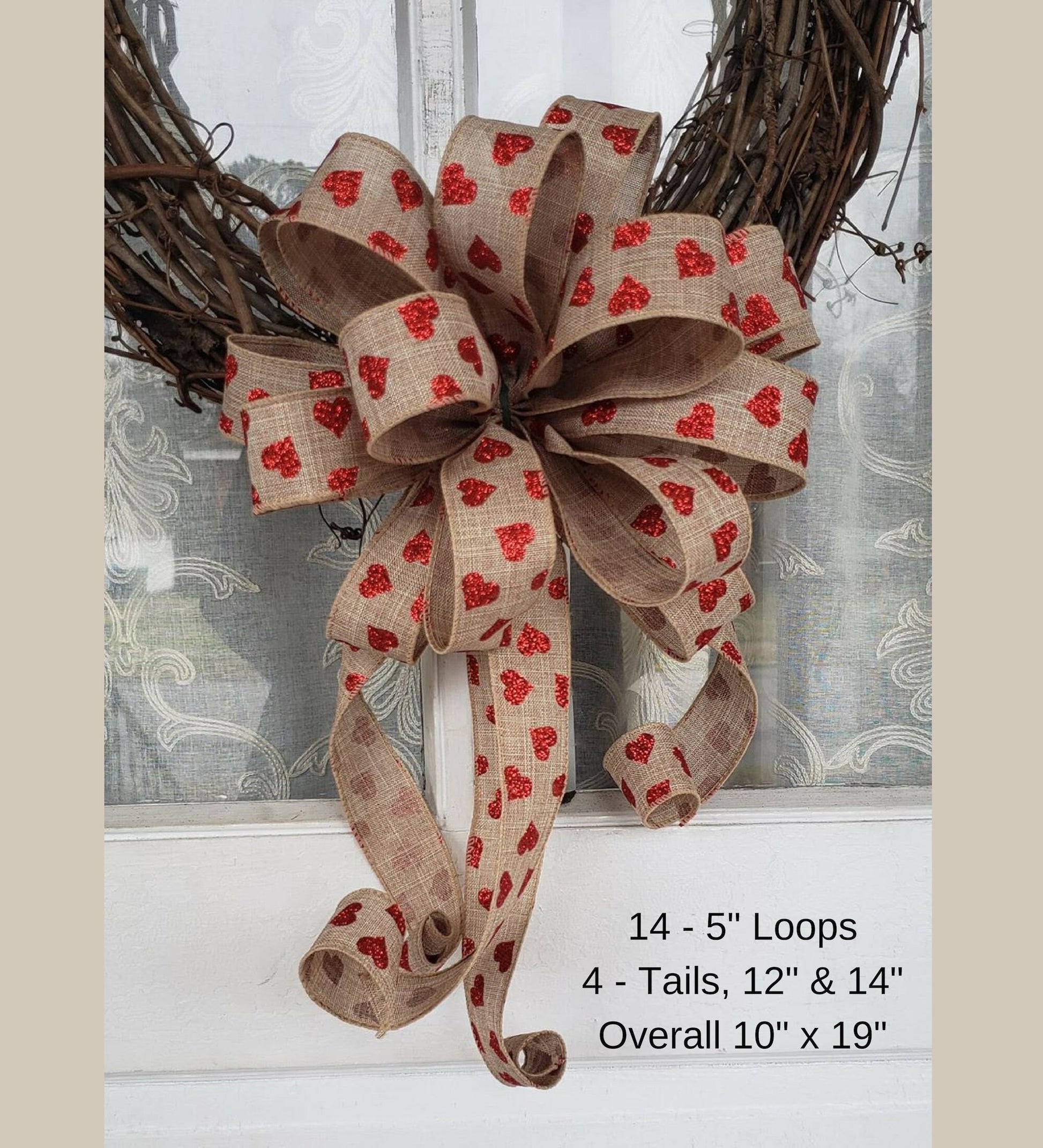 Red Glitter Heart Rustic Wreath Bow, Valentines Day Decor for front door, Valentine's Bow for Lanterns or Mailboxes
