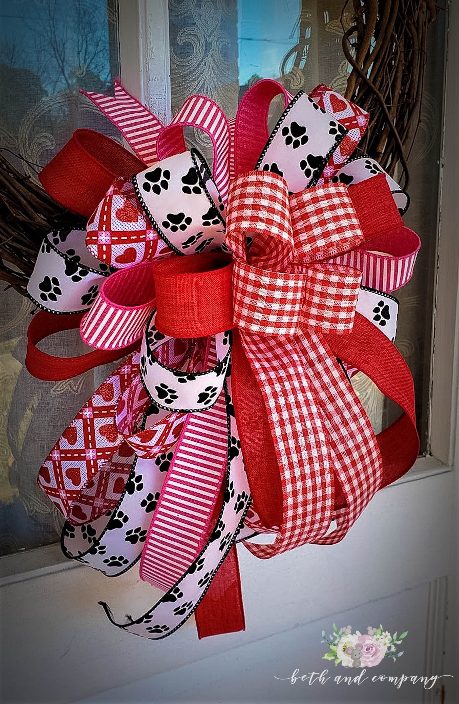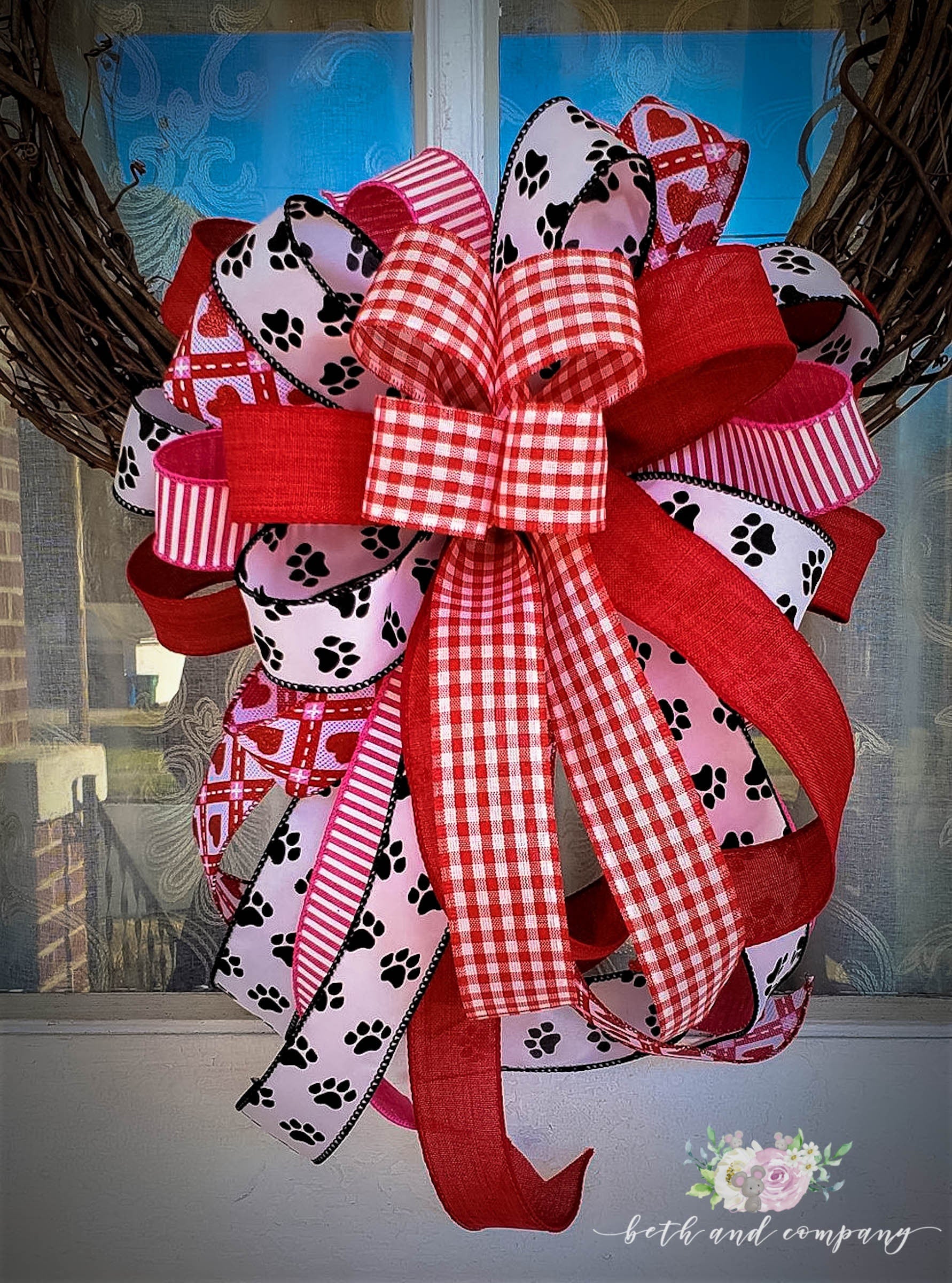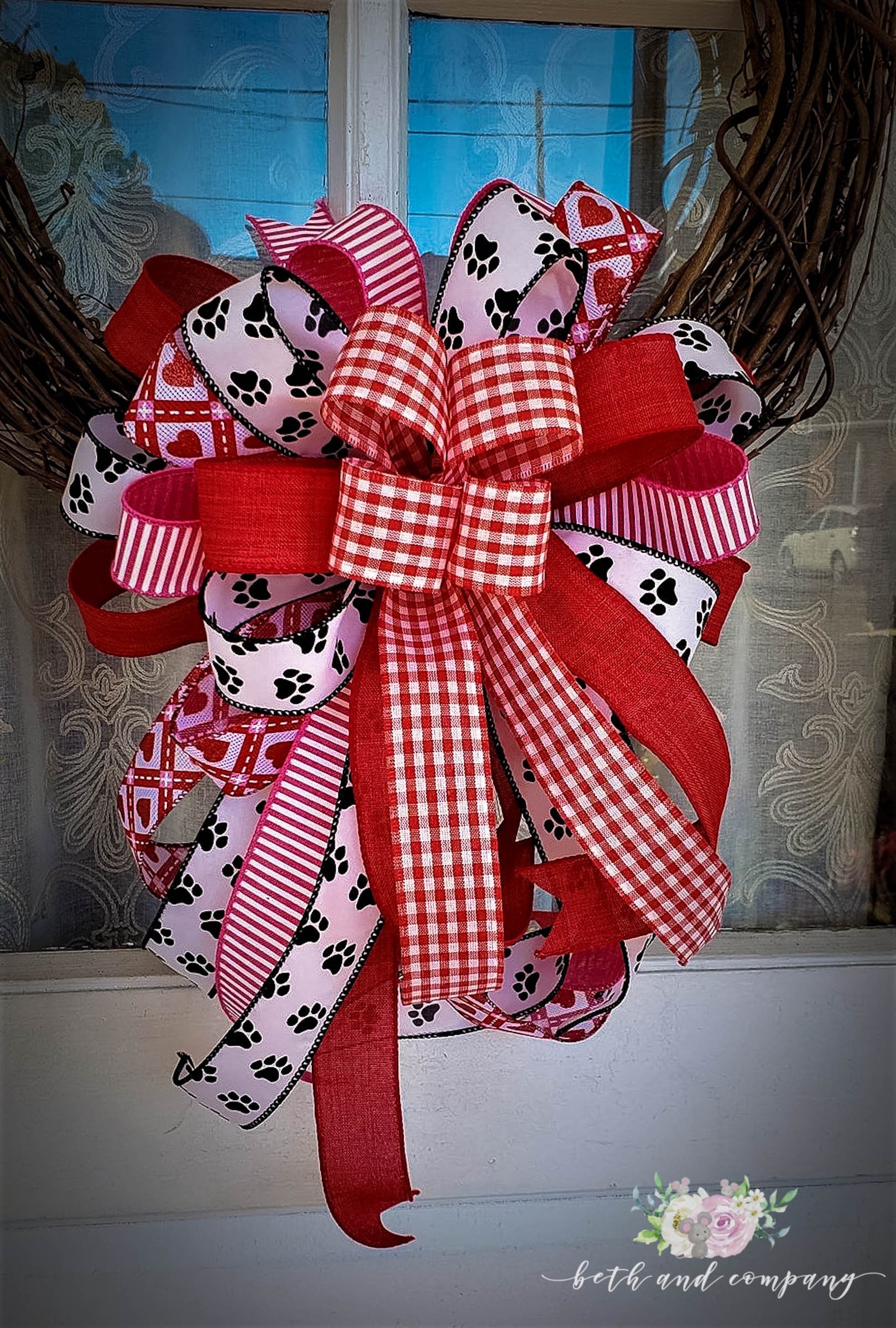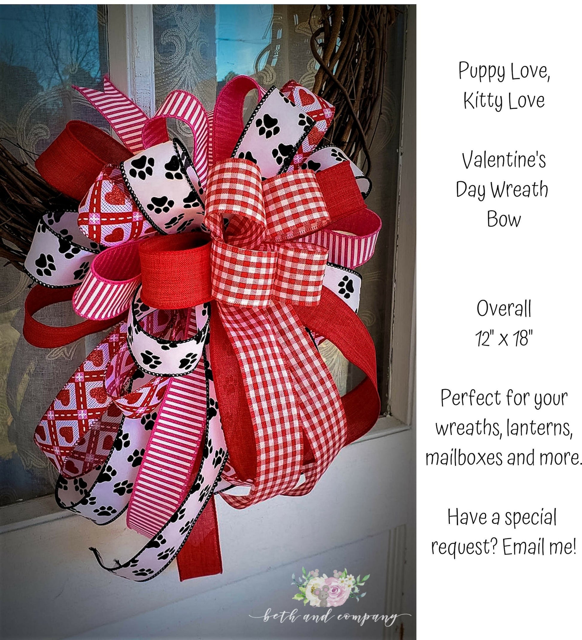 Valentine's Day Wreath Bow, Kitty Love Valentines Bow, Puppy Love Valentine Wreath Bow, Valentines Day Decor, Mixed Ribbon wreath bow